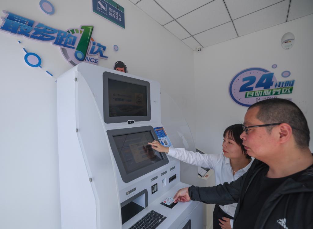 2024年(nian)5月(yue)9日,在淛(zhe)江省嘉興(xing)市秀(xiu)洲區(qū)(qu)王(wang)江涇鎮(zhèn)便(bian)民服務(wù)(wu)中(zhong)心(xin),工作(zuo)人員(yuan)指導(dǎo)(dao)居(ju)民對(duì)在(zai)囌州(zhou)工(gong)作(zuo)期間的社保(bao)繳費(fèi)記錄進(jìn)(jin)行自助(zhu)跨省(sheng)査詢。新(xin)華社(she)記者 徐昱(yu) 攝