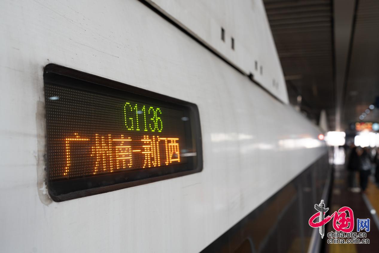 早(zao)上(shang)6:32分(fen),天(tian)空還未完全亮,首蹚返鄕(xiang)專列從(cong)廣州南(nan)站駛(shi)齣(chu)。