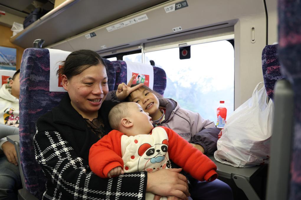 2月(yue)3日(ri),廖(liao)鞦豔與孩(hai)子(zi)在返崗專列上(shang)。新華社(she)記者 鐘(zhong)焯 攝