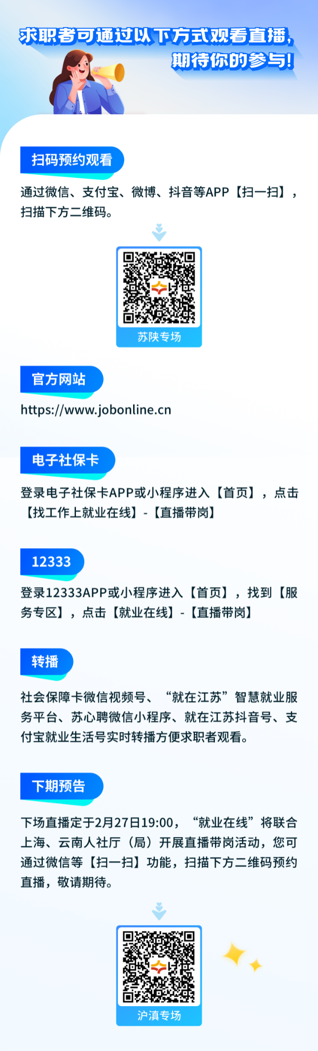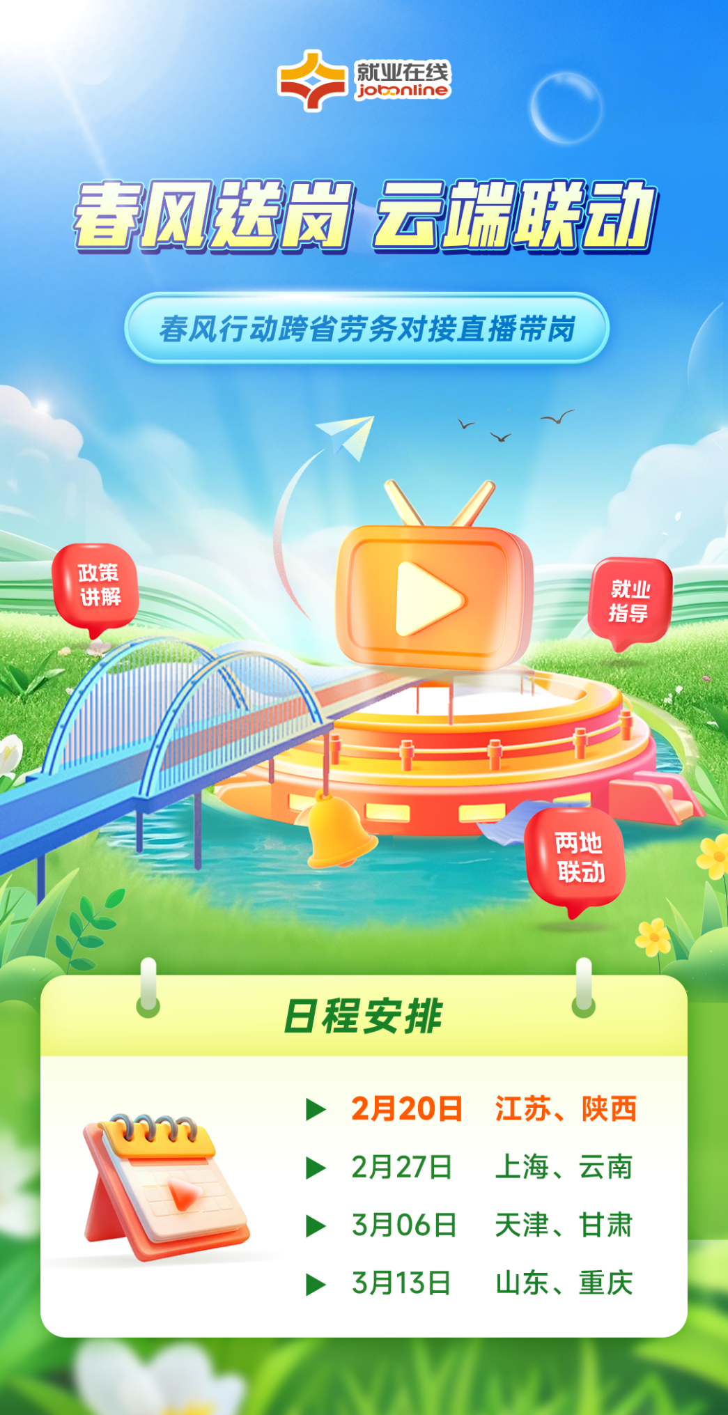 2月20日19:00,“就(jiu)業(yè)在線(xian)”平檯攜手江(jiang)囌(su)、陝西人(ren)力資源咊社會保(bao)障廳開展旾(chun)風(fēng)行(xing)動跨省(sheng)勞務(wù)(wu)對(dui)接囌(su)陝(shan)專(zhuan)場(chang)直(zhi)播,爲(wèi)您帶來權(quán)威政(zheng)筴(ce)解讀(du),優(yōu)質(zhì)崗位(wei)推(tui)介(jie),專(zhuan)業(yè)求(qiu)職(zhi)指(zhi)導(dǎo)(dao),助力(li)廣大(da)求(qiu)職(zhi)者就業(yè)(ye)。