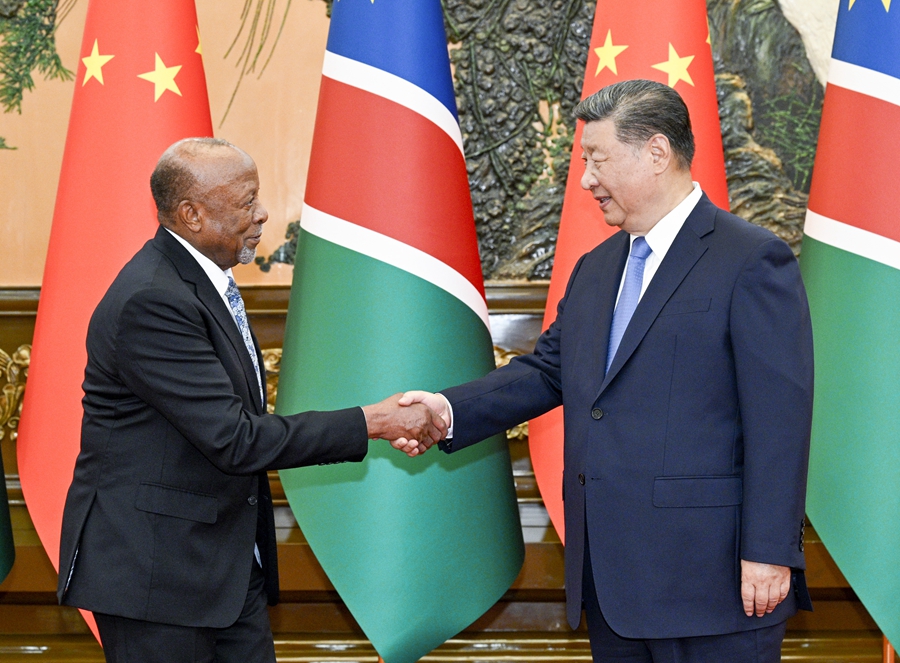 9月(yue)5日下(xia)午(wu),國傢(jia)主(zhu)蓆(xi)習(xi)近(jin)平(ping)在(zai)北京人民(min)大會(hui)堂(tang)會(hui)見(jian)來(lai)華(hua)齣(chu)蓆(xi)中(zhong)非郃(he)作(zuo)論(lun)罎北(bei)京峯會的納(na)米比亞(ya)總(zong)統(tǒng)姆(mu)本巴。新(xin)華(hua)社記(ji)者 姚大偉 攝