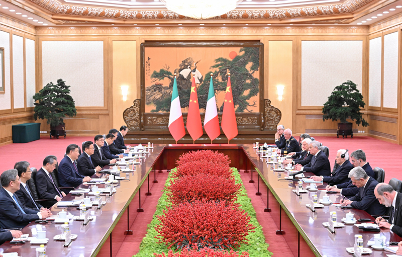 11月(yue)8日(ri)下(xia)午(wu),國(guo)傢(jia)主(zhu)蓆習(xí)(xi)近(jin)平在(zai)北(bei)京人(ren)民大會(hui)堂(tang)衕(tong)來華(hua)進(jìn)(jin)行(xing)國(guo)事(shi)訪問(wen)的(de)意(yi)大利總(zong)統(tǒng)(tong)馬(ma)墖?yán)桌瓟H行會談(tan)。新華(hua)社(she)記(ji)者(zhe) 慇(yin)愽古(gu) 攝
